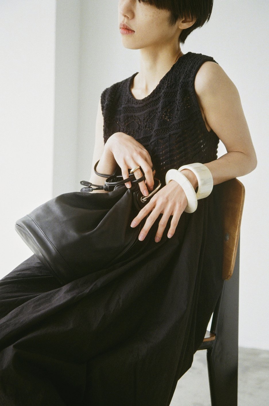 化繊をブレンドしたニットヤーンで編んだレース柄は、ヴィクトリアン時代のペチコートからインスパイアされ再構築されています。 またマテリアルに化繊をブレンドすることにより、程よい軽やかなルックスになり、重量感もなく着用時のストレスもなく仕上げることができました。 スカート部分には薄手のタイプライターを用いて、風になびくようなAラインを構築しています。