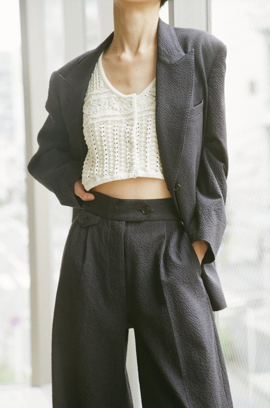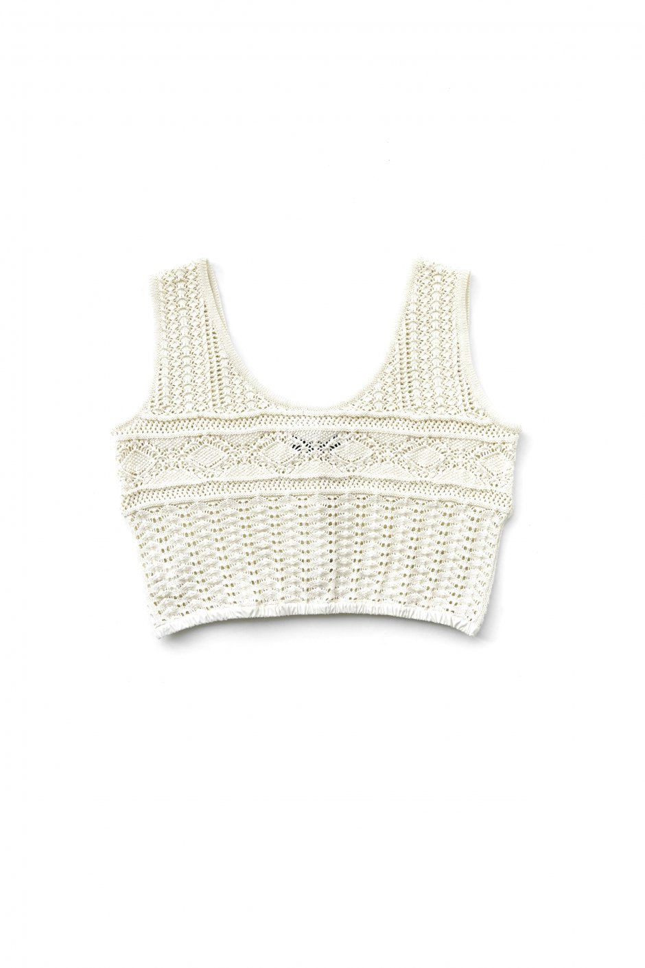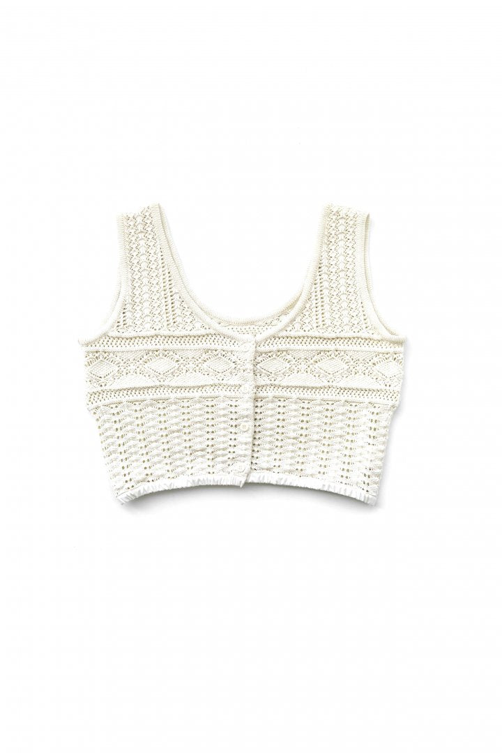 ドレス同様に、ビクトリアン時代のペティコートのニットパターンからインスパイアされたレース編み柄は、強く美しい佇まいです。 ショートレングスのトップスは少ない面積ですが、存在感があり、スーツのインナーやオーバーオールなど幅広くフィットしてくれます。