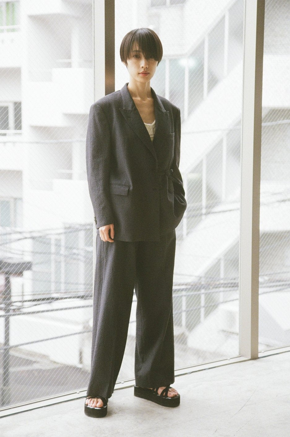 ニット部分には、化繊をブレンドしたコットン。 布帛部分には、ハイカウントで織り上げたタイプライターを用いています。 違和感なく切り替えられたマテリアルは、古臭くなりすぎず、モダンで品の良い佇まいをしています。