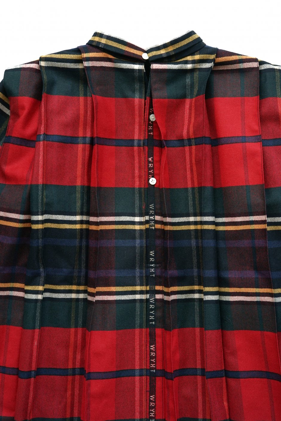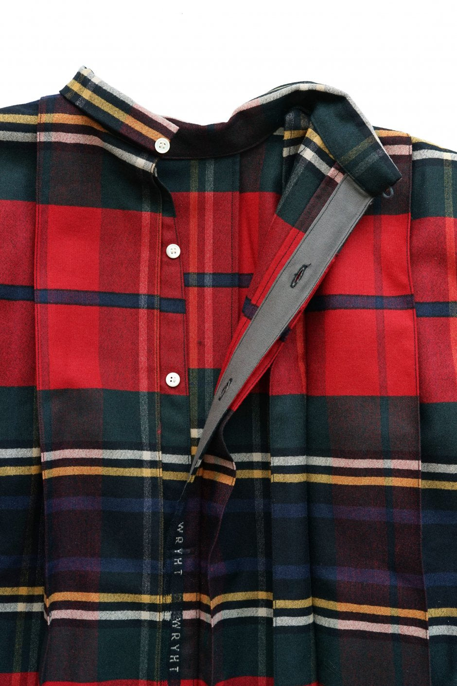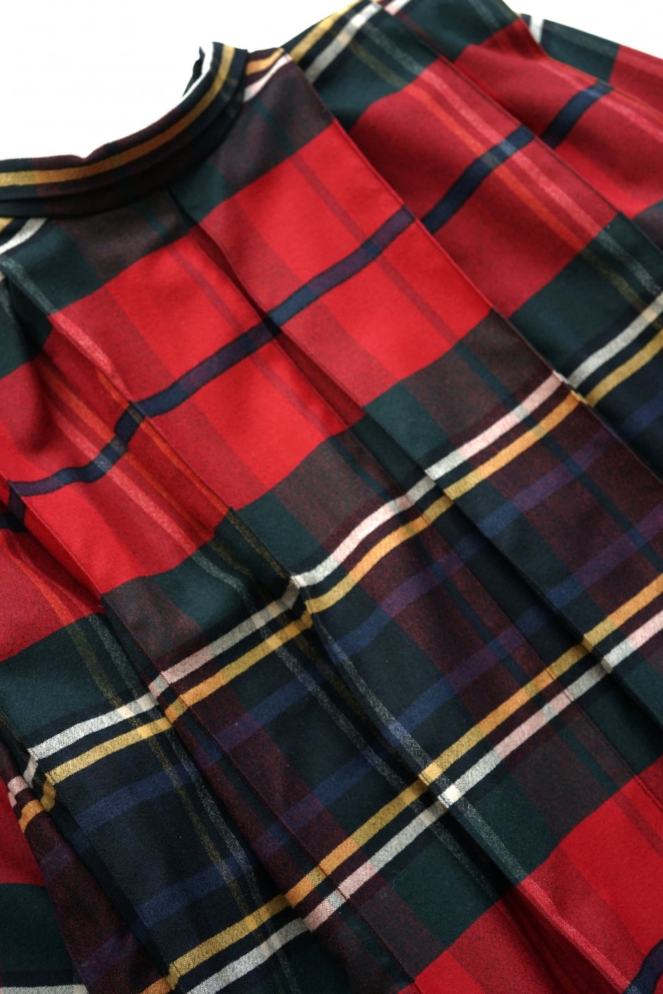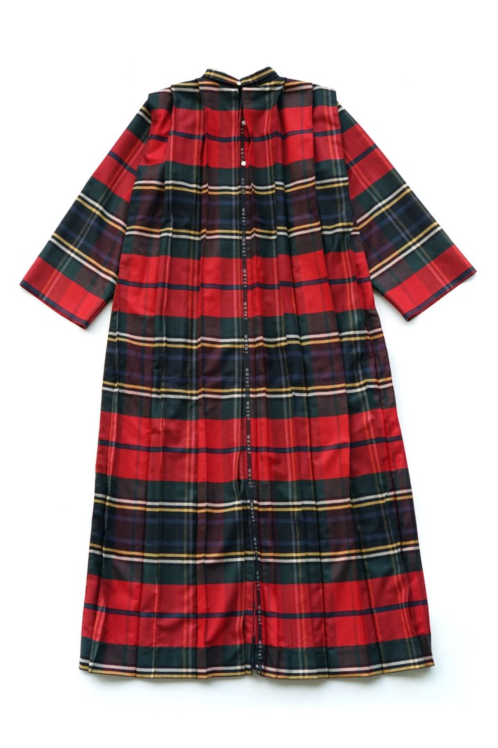 大きく畳まれたプリーツが目を引く大胆なデザインのドレス。 裾までストレートに落ちる美しいラインに、オリジナルテキスタイルのビックプレイドが他にはない佇まいになります。 またマテリアルのセルビッチに配したブランドロゴを、ポイントで使用しているのもユニーク。 古い時代の神父のユニフォームからのインスピレーションとなります。