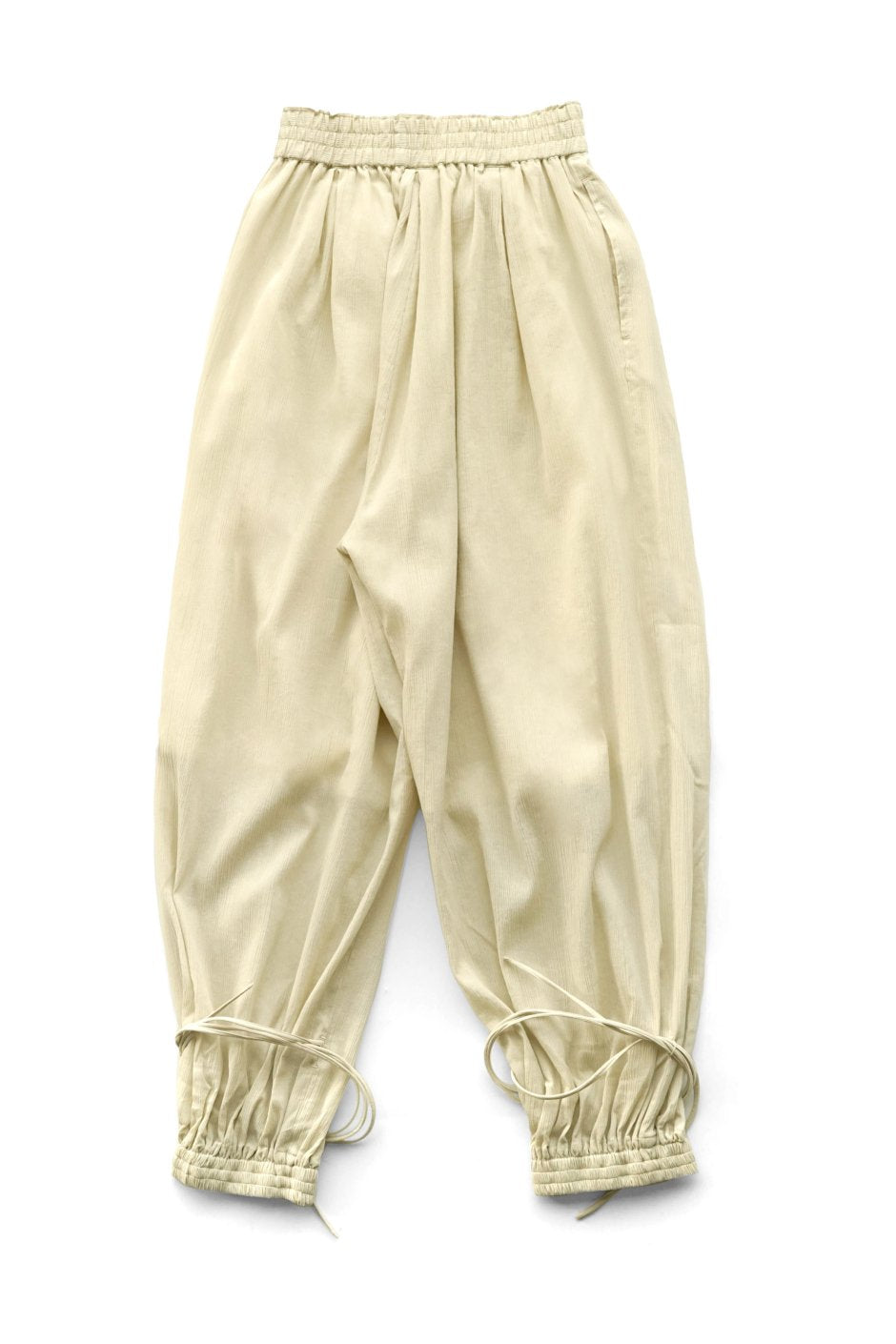 トップスとセットアップで提案されるトラウザー。デザインインスピレーションは、アジアの伝統的な衣装から。 民族衣装ならではのゆったりとしたコンフォートフィッテイングが特徴的。また裾に配されるコードをぐるぐるっと足首付近に巻きつけてラインに変化をつけさせることが可能。