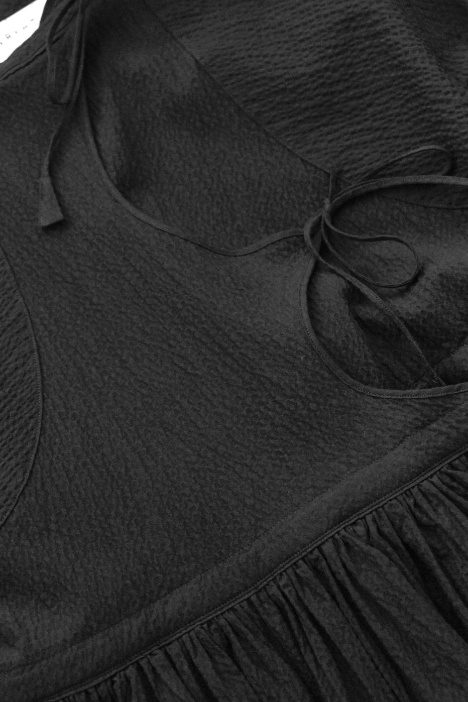 曲線を描くアシンメトリーなフロントラインとリボンがとてもユニークなピース。 デザインインスピレーションはインドの少数民族の伝統的な衣装となります。 ウエスト部分には細かなギャザーが寄せてあり、内側からドローコードで絞りを調整できるようになっています。 今期は生地表面が波打ったようなサッカー生地を用いました。
