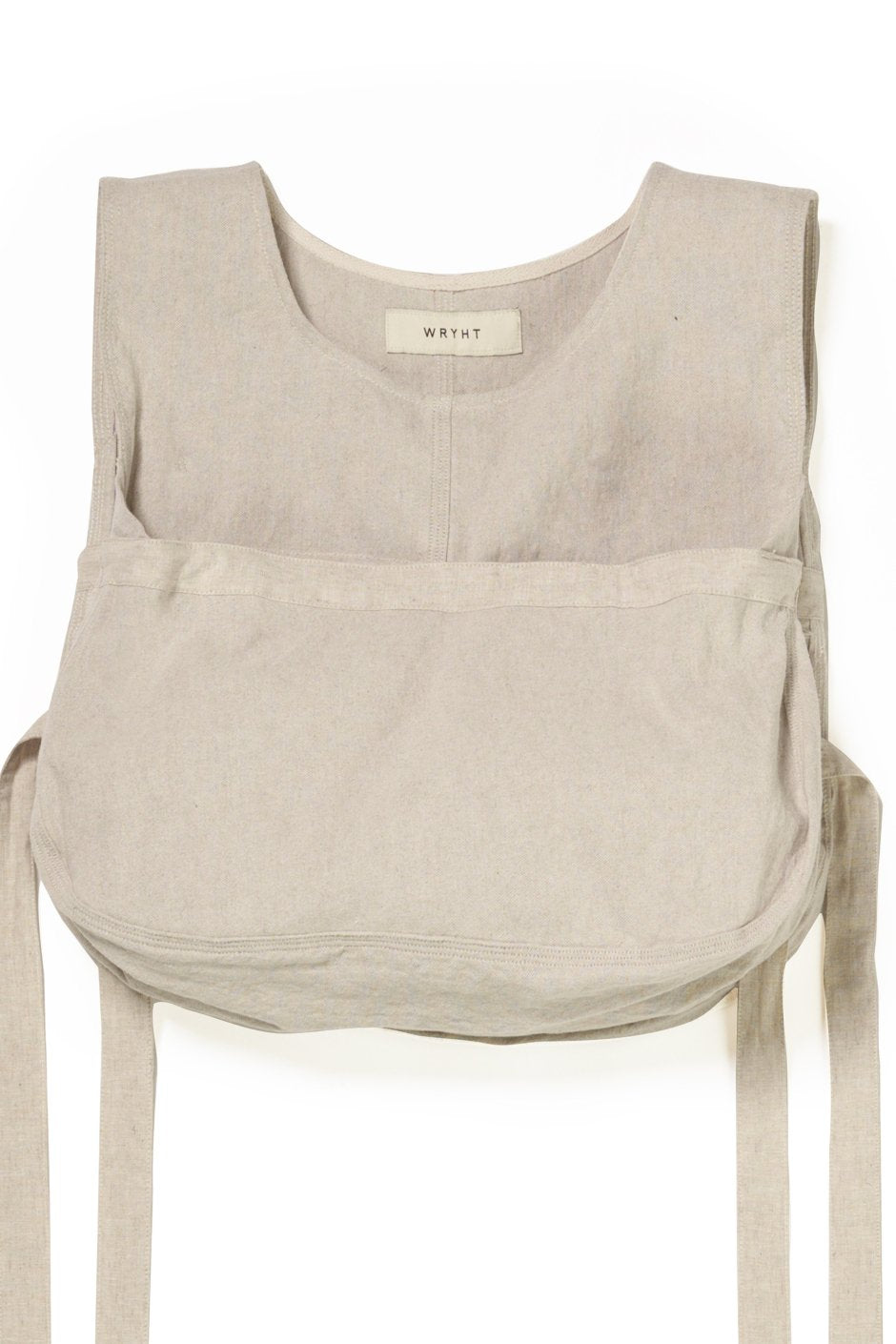 アイテム名でも分かる様に新聞配達の際に使用されていたユニフォームがインスピレーションとなります。 大容量の収納力があるバッグを着る様なユニークなルックスを持つプルオーバーベスト。ファブリックには国内で織り上げた、経糸に25/1のリネンと緯糸に10/1のコットンで太番手の生地を揉み込み表情感を出しております。生地の加工特性上、シワが発生する場合がございます。ご了承ください。
