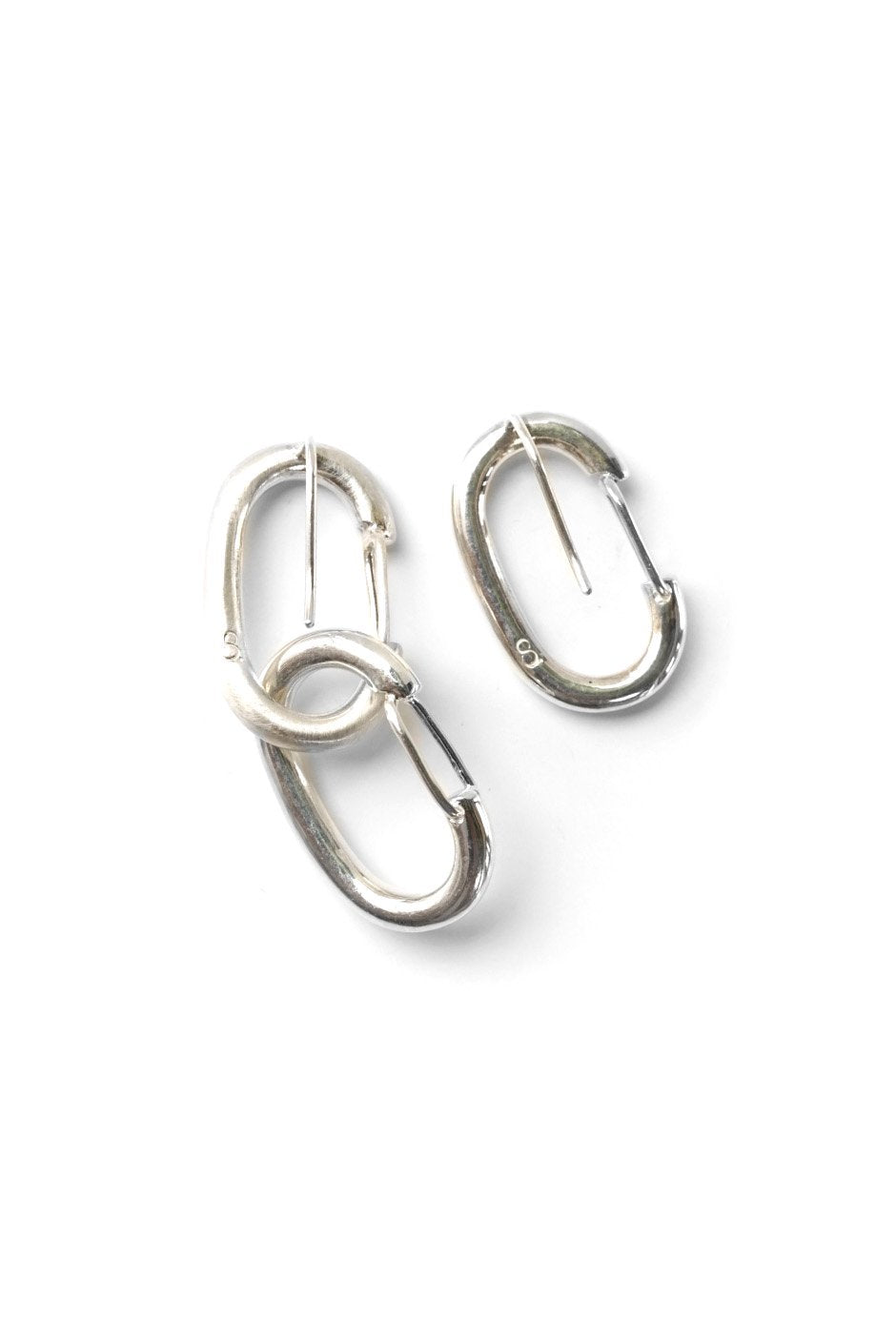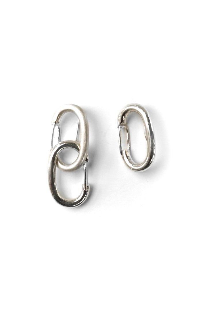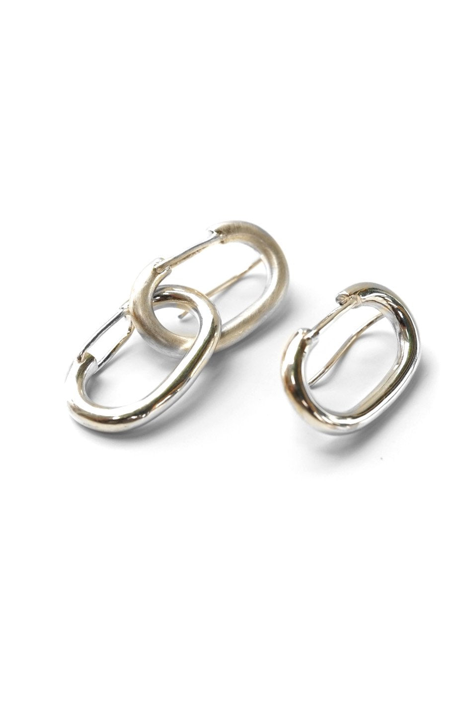 8UEDEオリジナルシェイプのナスカンを、マット とグロスのテクスチャーに仕上げ、アシンメト リーに製作したミニマルなピアス。