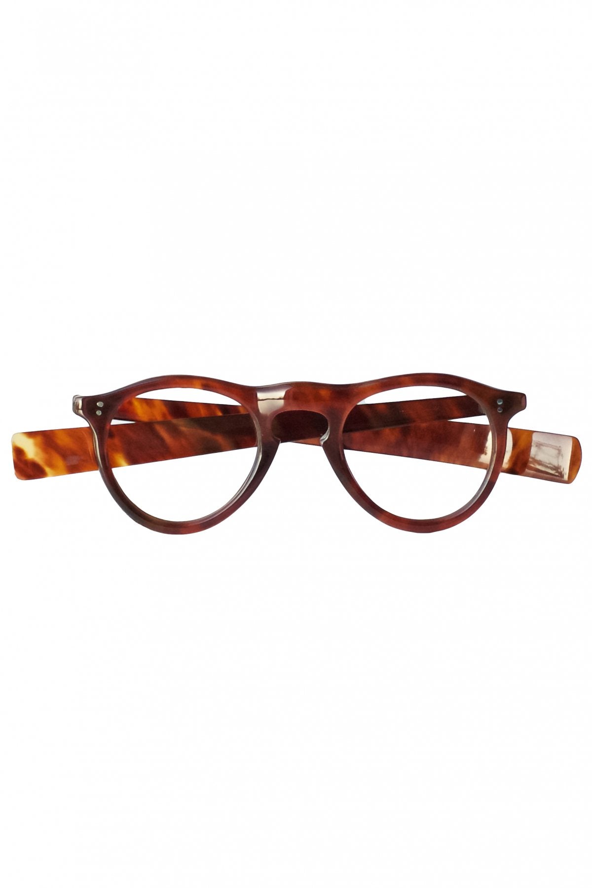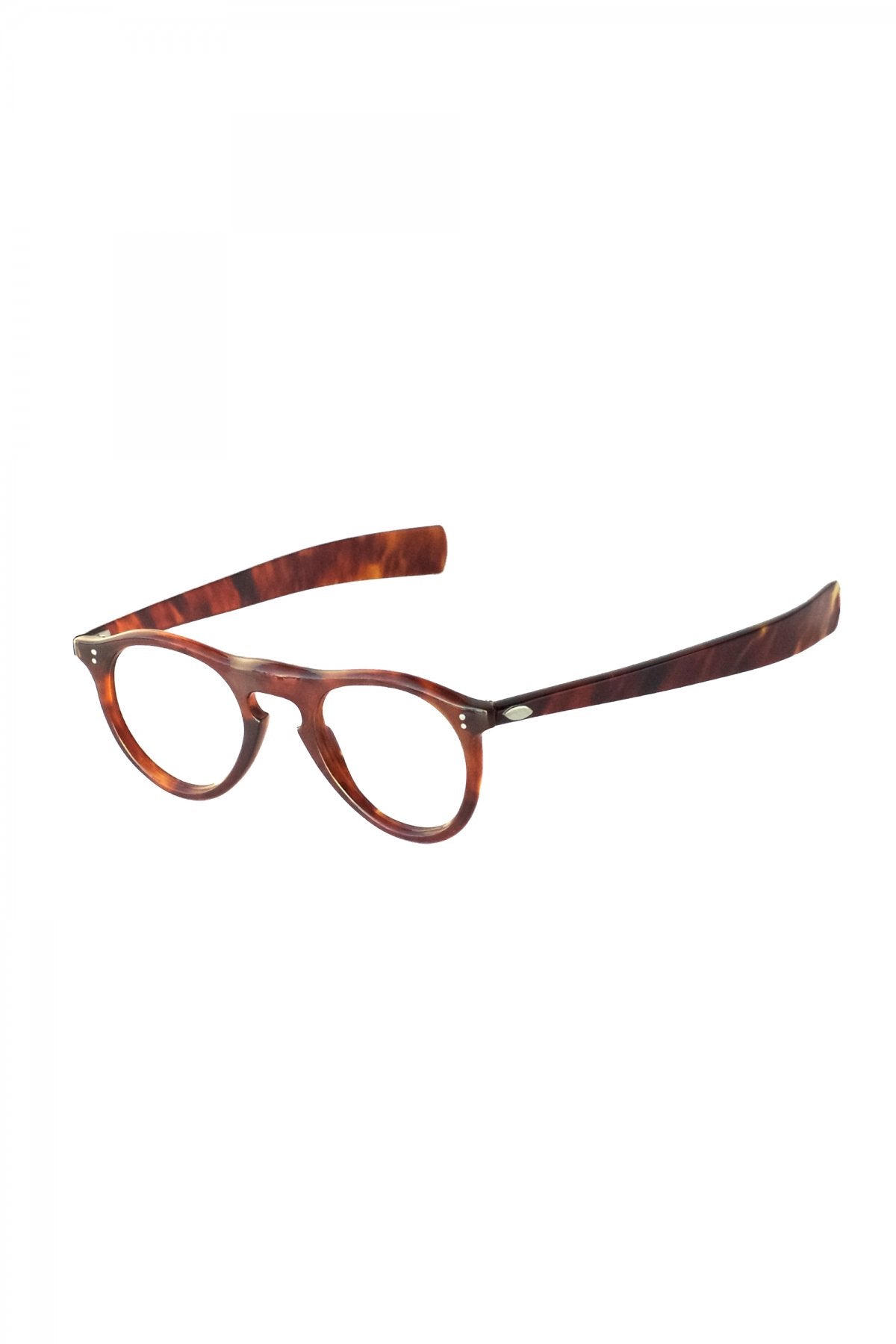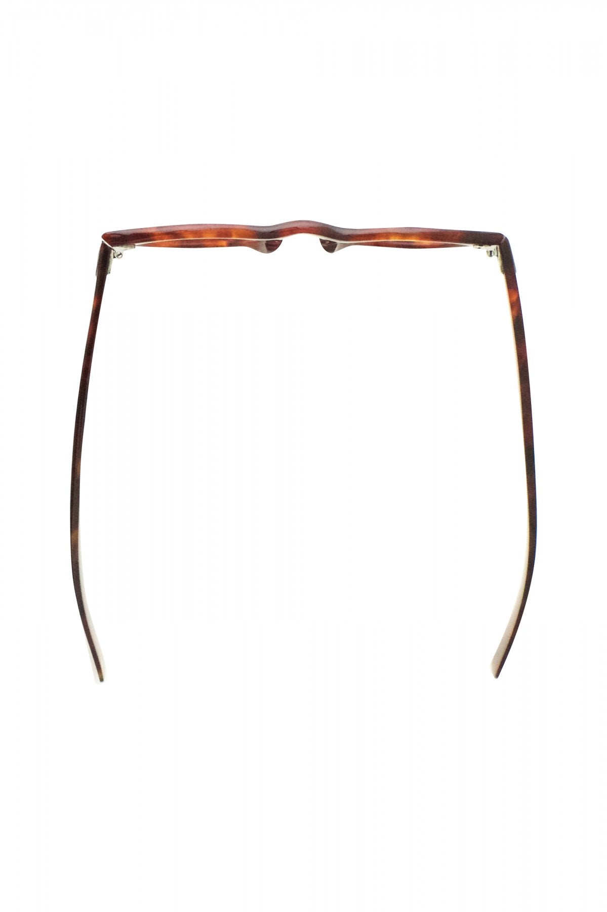 生地は本鼈甲を使用し、アッパーブリッジのキーホール型フロントにウェリントン型とボストン型の中間的なレンズ枠のデザイン。3枚蝶番のスマートなテンプルからエンド部にかけて広がるクラシックなライブラリーテンプル。