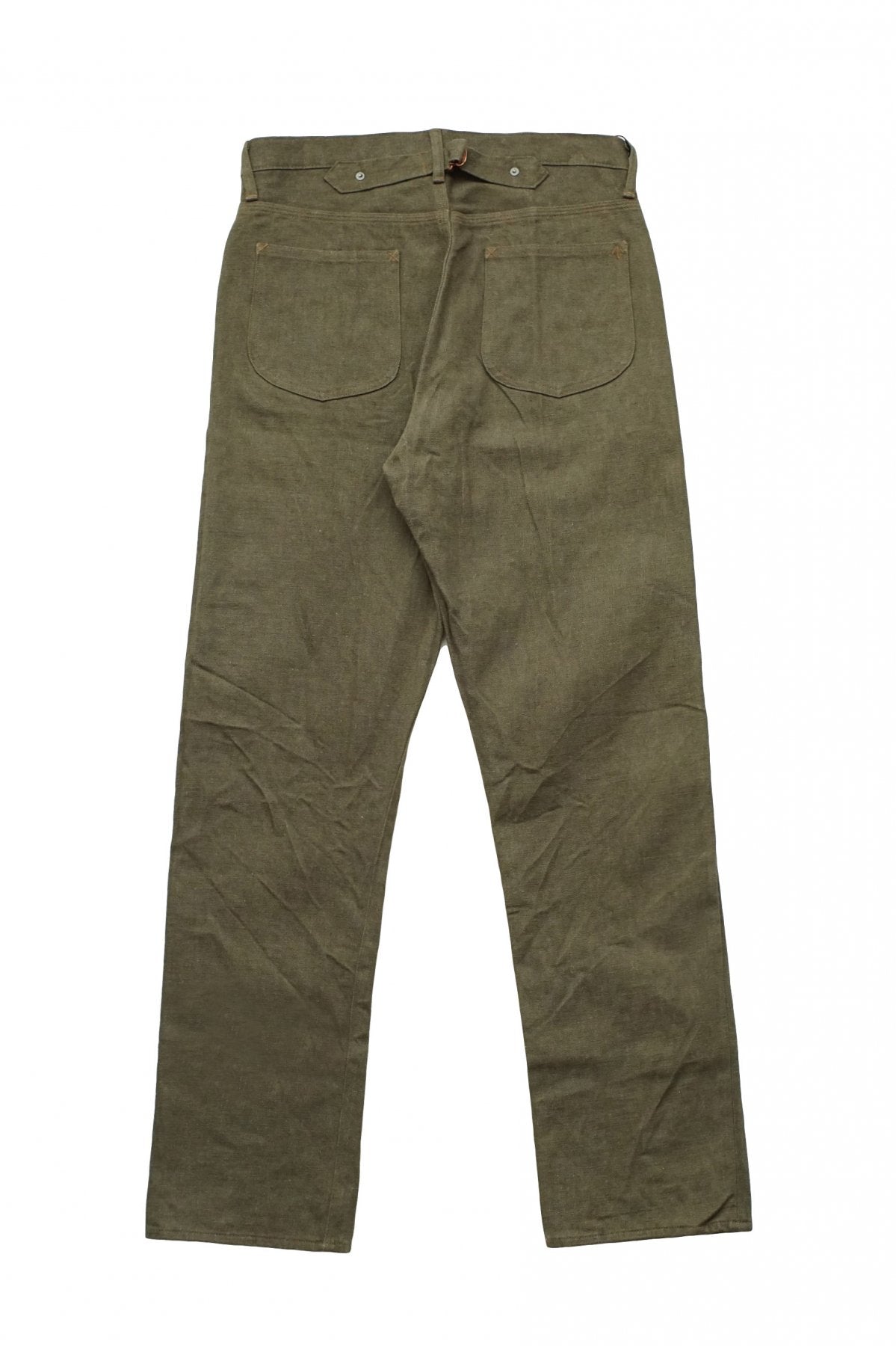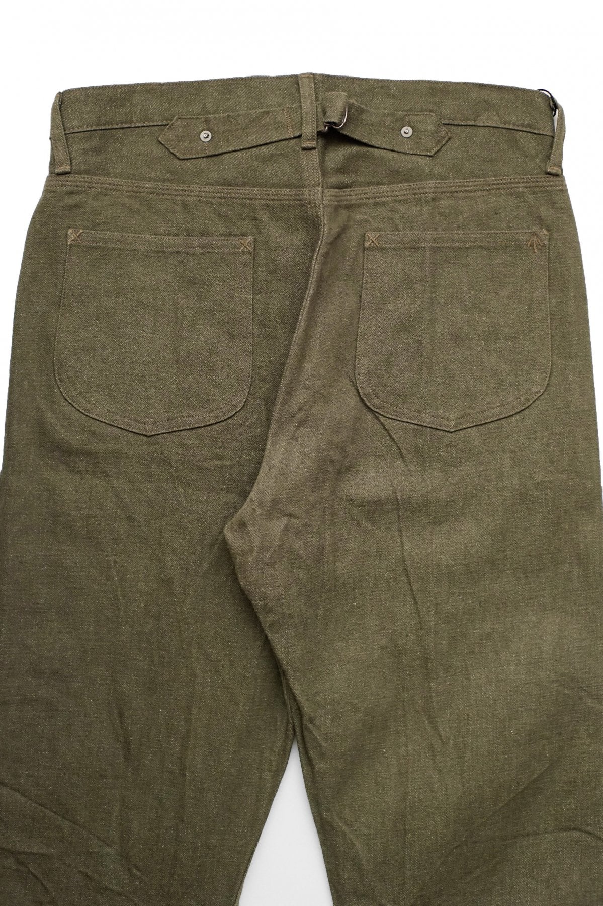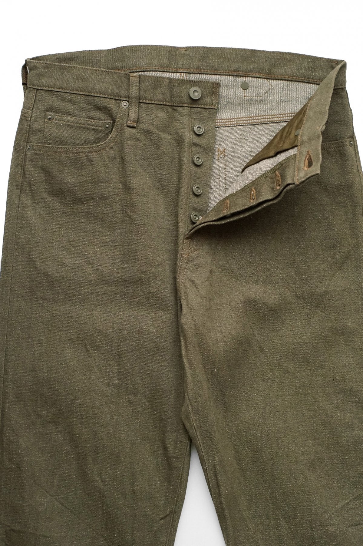 ビンテージのデニムを徹底解析。現代に蘇らせたスペシャルファブリック。 大戦下に生まれ、ほんの短かな期間しか存在しなかった希少なデニムを再現。 インディゴカラーとは異なりタテ糸は7番に固定しています。 インディゴに比べ色調が浅く異番手で織ると組織が立ちすぎてけばけばしく見える為です。 オリーブカラーでは横方向にナチュラルな段差が確認出来るのは、昔の力織機のテンションを 再現するために製織速度を70%まで落として織っているからです。