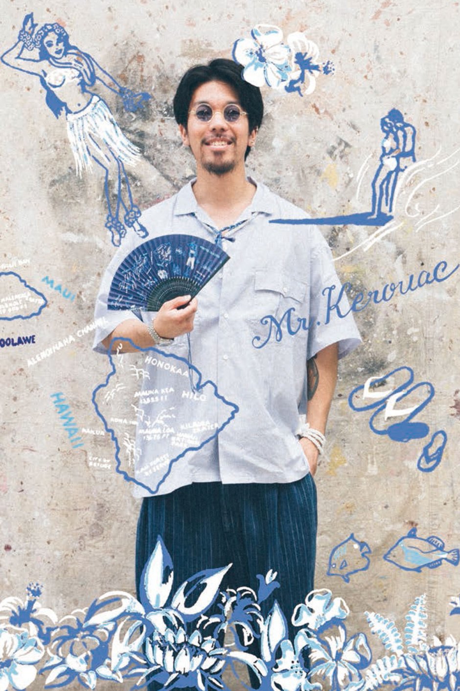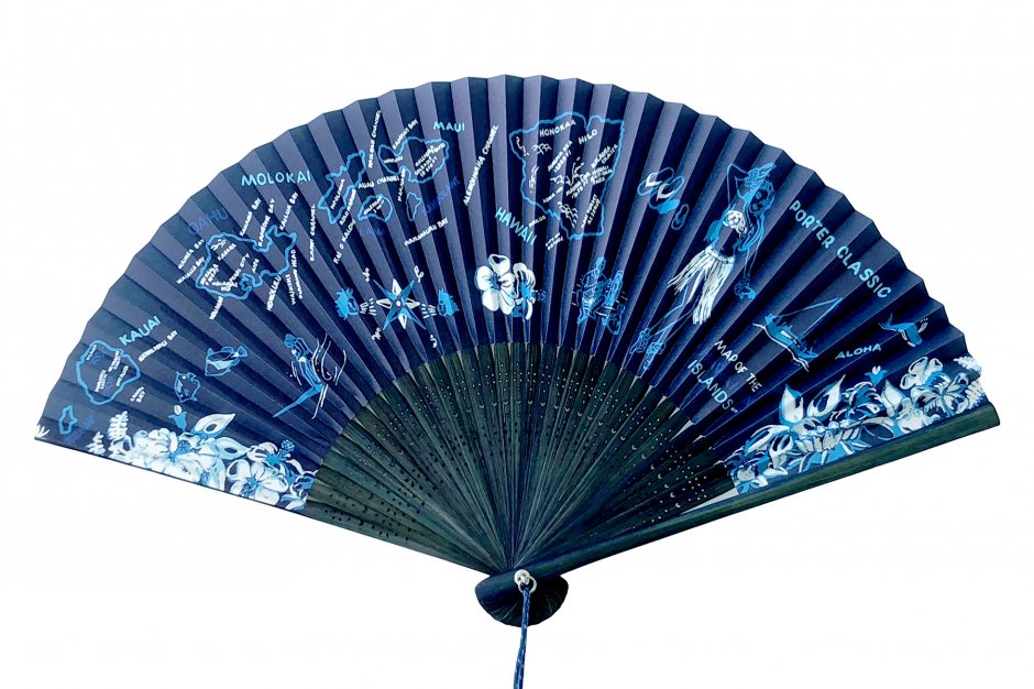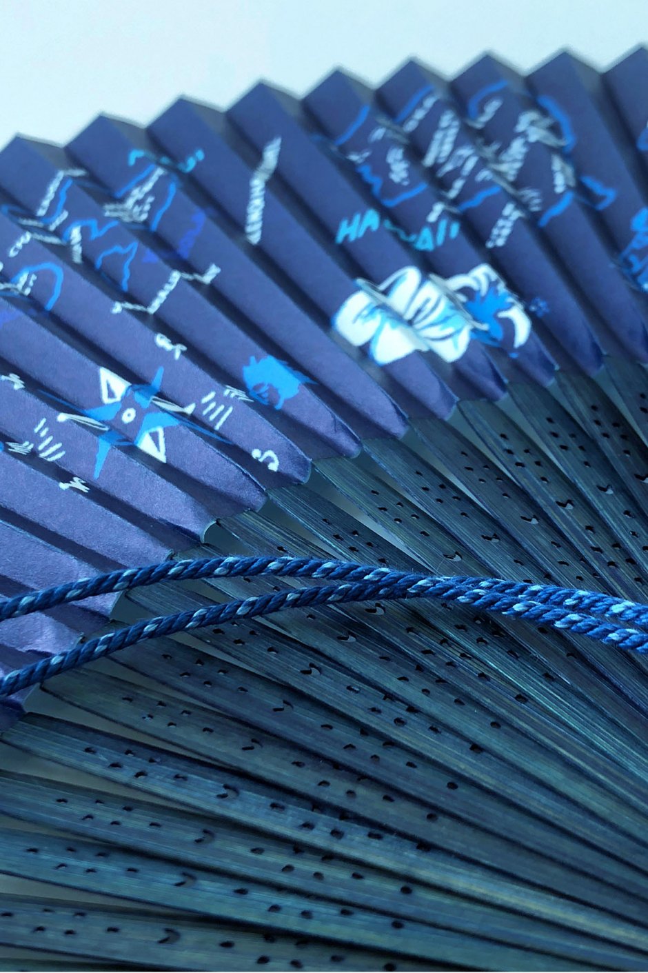 ロゴデザインを手掛けるmimoe氏によるデザイン。ハワイアンイラスト、藍染した竹、そしてカウアイ島の森林をイメージした香料。京都で生産されたMade in JAPANの扇子。男女使えるサイズ感はペアで親子で楽しめる。夏の必需品。
