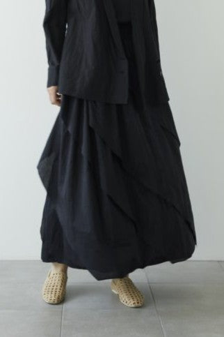 ゴム仕様のウエストや足首が見える丈間がカジュアルな穿き心地ですが、スカート全体を螺旋状に囲う海藻に見立てた大きなフリルがゆったりと揺れる様子やシルクの光沢が華やかで優雅な印象のスカートです。