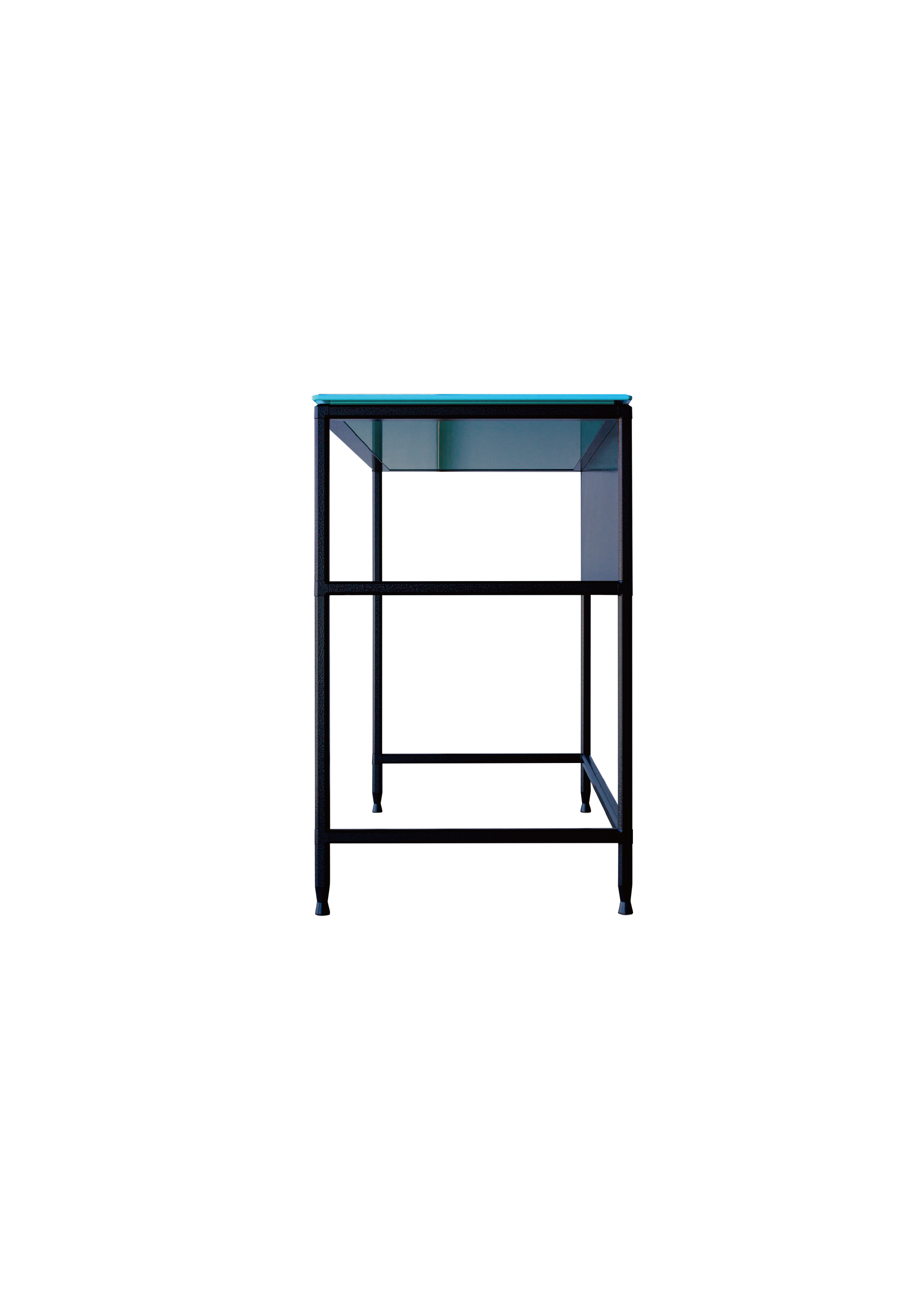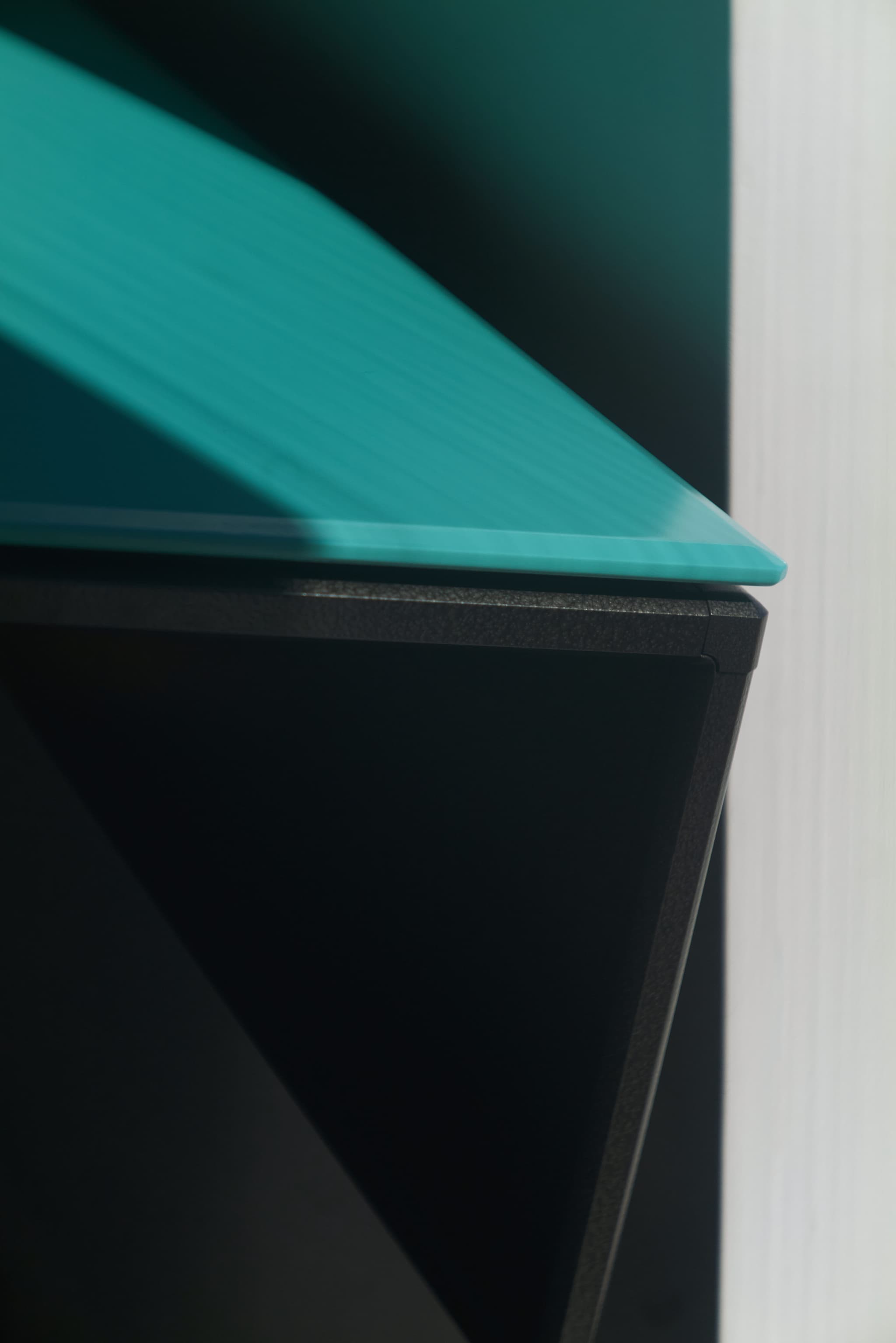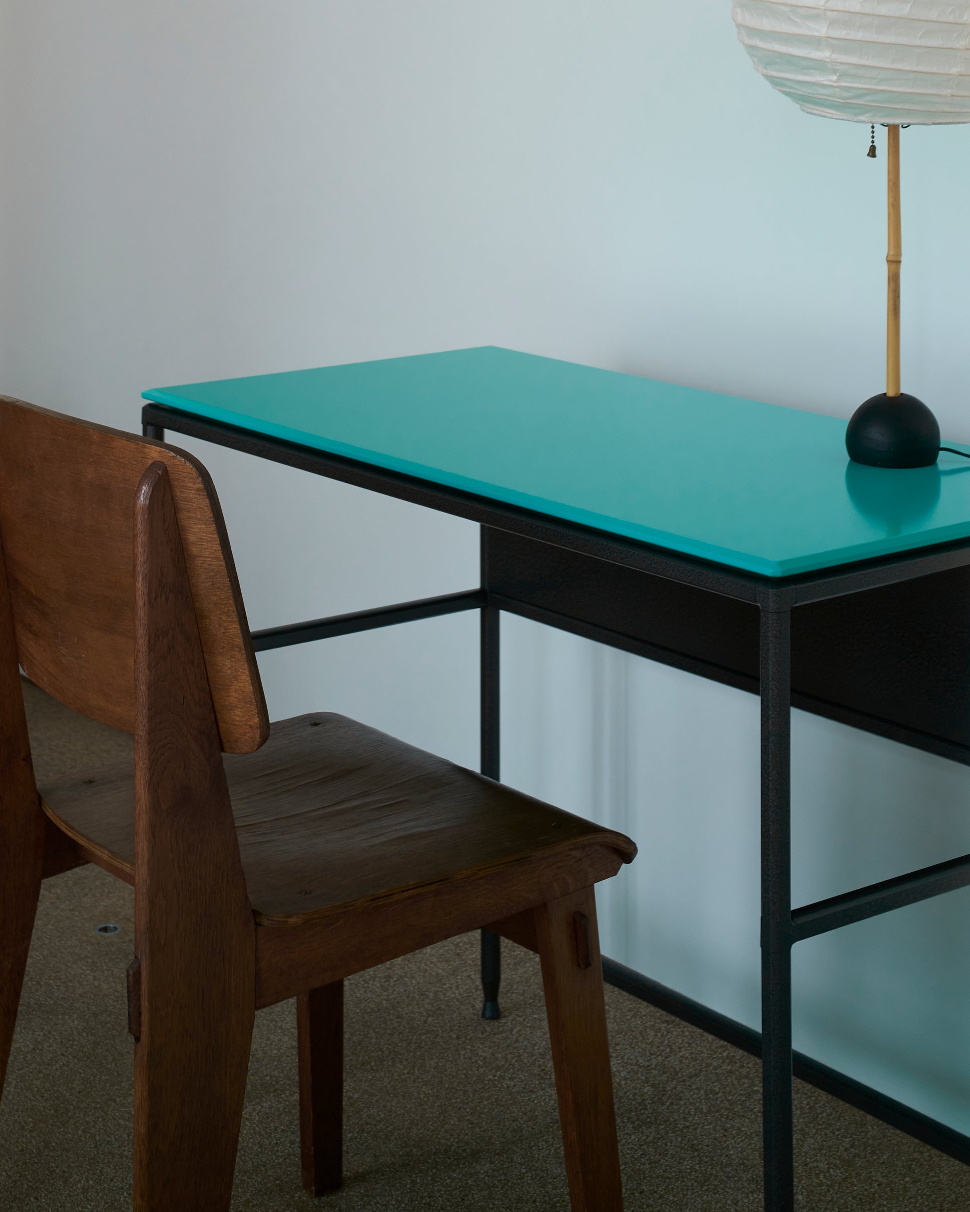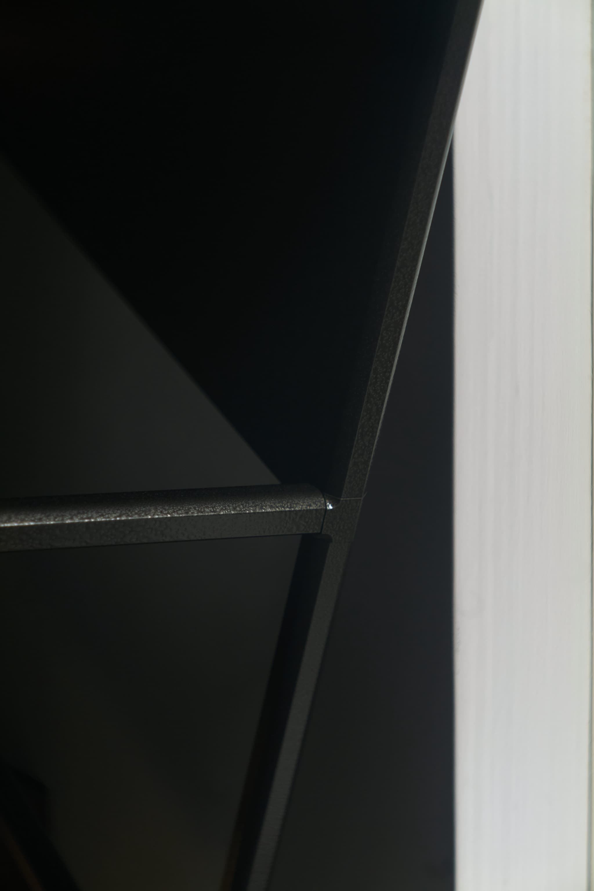 本デスクをかたちづくるのは、印象的な天板カラーと、強い存在感を放つフレーム仕上げという二つの要素。それぞれ異なる背景から導かれたディテールが重なり合い、この一台の佇まいを決定づけています。