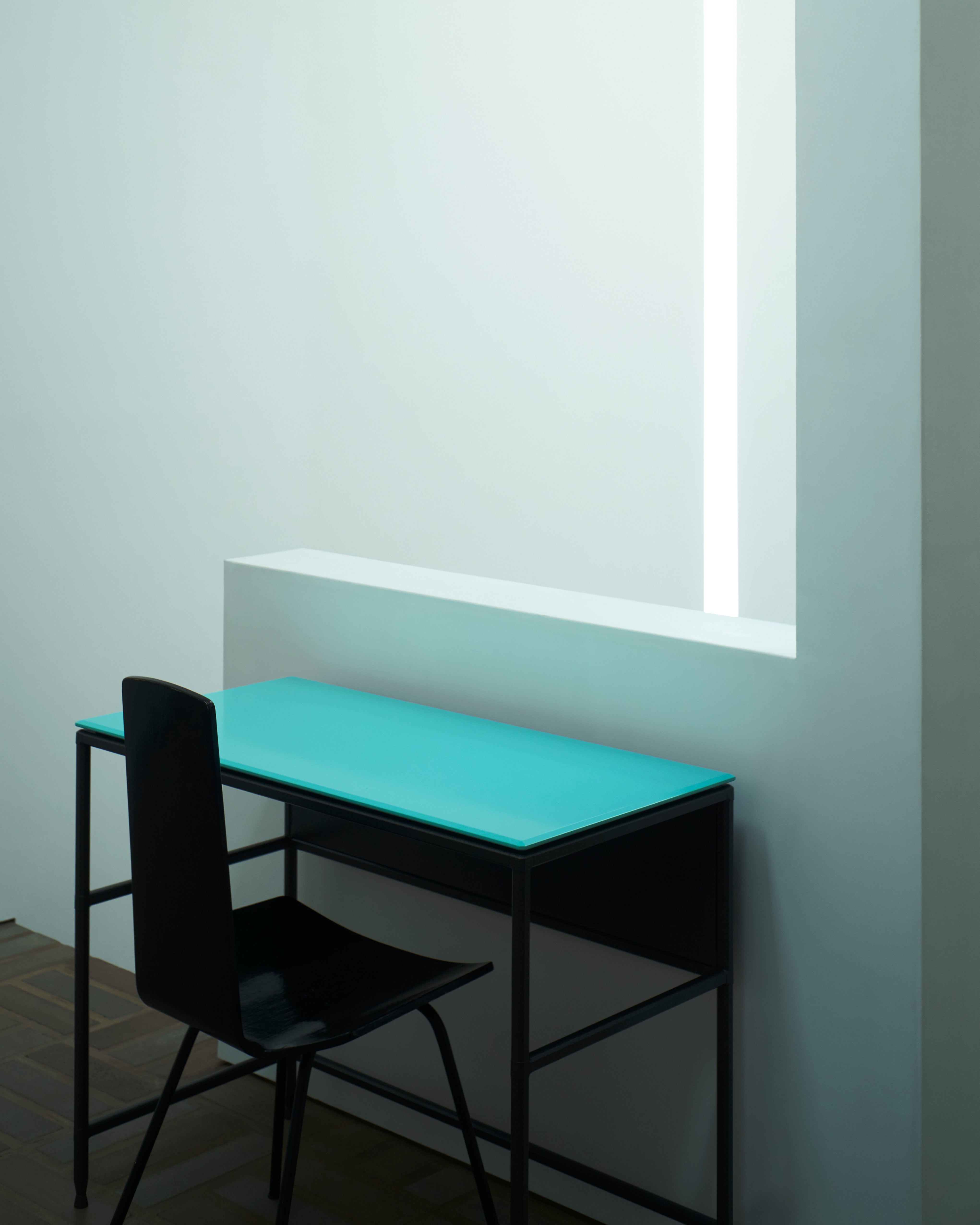 「大勉強するためのデスクならば」と坂矢が直観的に選んだこの色は、従来の勉強机のイメージとは対照的ながら、思考に明るさをもたらし、硬直しがちな空気をやわらかく解きほぐす、「学びの時間」に新たなリズムを与える色彩です。
